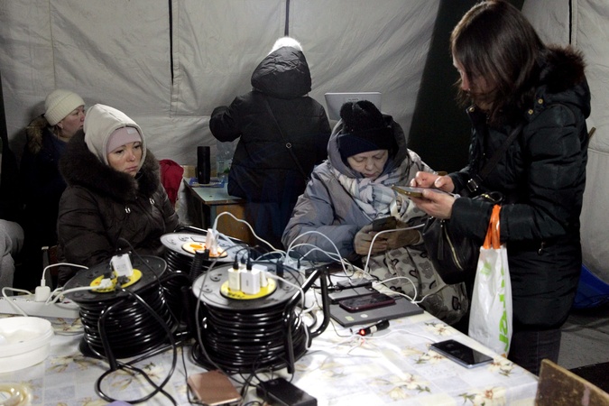 People charge mobile phones and power banks at a mobile heating point in the Desnianskyi district of Kyiv, Ukraine, on January 22, 2026. The heating point was deployed amid power and heating outages after Russian attacks on energy infrastructure, Credit:Hennadii Minchenko / Avalon