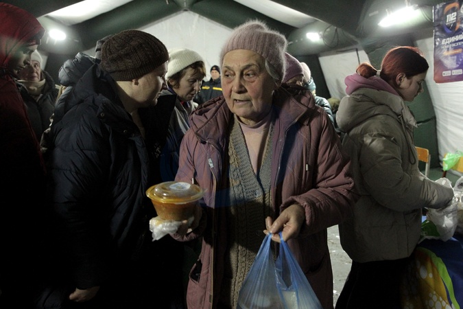People receive free hot meals from the charity World Central Kitchen at a mobile heating point in the Desnianskyi district of Kyiv, Ukraine, on January 22, 2026. The heating point was deployed amid power and heating outages after Russian attacks on energy infrastructure, Credit:Hennadii Minchenko / Avalon