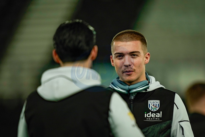 Alfie Gilchrist of West Bromwich Albion speaks to Alex Mowatt of West Bromwich Albion while they inspects the pitch prior to kick off during the Sky Bet Championship match Derby County vs West Bromwich Albion at Pride Park Stadium, Derby, United Kingdom on 23 January 2026, Credit:Maynard Manyowa/News Images / Avalon