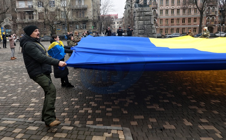 Participants unfold a 13-meter national flag of Ukraine in Taras Shevchenko Park during Unity Day celebration in Odesa, Ukraine, on January 22, 2026, Credit:Nina Liashonok / Avalon