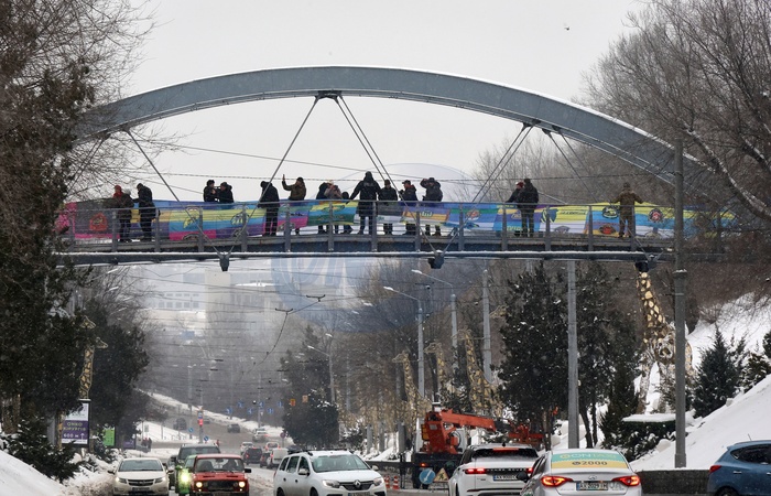 Activists unfurl a 70-meter flag made from banners of military units from the Anti-Terrorist Operation (ATO) period on the Zoolohichnyi Bridge to mark Ukraine's Unity Day in Kharkiv, Ukraine, on January 22, 2026, Credit:Viacheslav Madiievskyi / Avalon