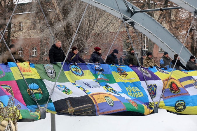 Activists unfurl a 70-meter flag made from banners of military units from the Anti-Terrorist Operation (ATO) period on the Zoolohichnyi Bridge to mark Ukraine's Unity Day in Kharkiv, Ukraine, on January 22, 2026, Credit:Viacheslav Madiievskyi / Avalon