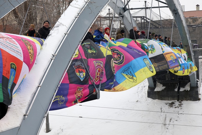 Activists unfurl a 70-meter flag made from banners of military units from the Anti-Terrorist Operation (ATO) period on the Zoolohichnyi Bridge to mark Ukraine's Unity Day in Kharkiv, Ukraine, on January 22, 2026, Credit:Viacheslav Madiievskyi / Avalon