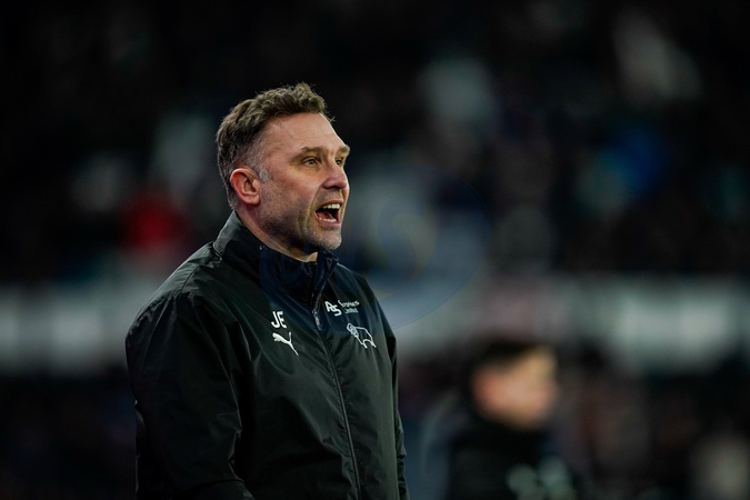 John Eustace manager of Derby County gives his team instructions during the Sky Bet Championship match Derby County vs West Bromwich Albion at Pride Park Stadium, Derby, United Kingdom on 23 January 2026, Credit:Maynard Manyowa/News Images / Avalon