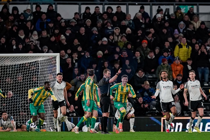 Referee Anthony Backhouse awards a goal via goal line technology during the Sky Bet Championship match Derby County vs West Bromwich Albion at Pride Park Stadium, Derby, United Kingdom on 23 January 2026, Credit:Maynard Manyowa/News Images / Avalon
