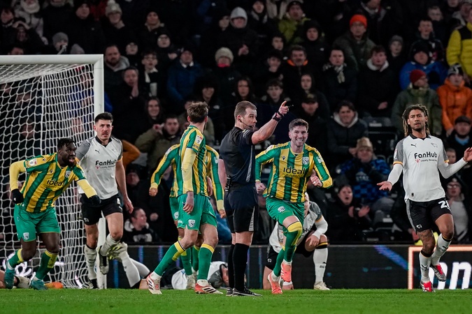 Referee Anthony Backhouse awards a goal via goal line technology during the Sky Bet Championship match Derby County vs West Bromwich Albion at Pride Park Stadium, Derby, United Kingdom on 23 January 2026, Credit:Maynard Manyowa/News Images / Avalon