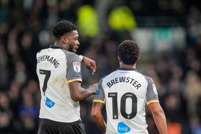 Patrick Agyemang of Derby County celebrates his goal to make it 1-0 during the Sky Bet Championship match Derby County vs West Bromwich Albion at Pride Park Stadium, Derby, United Kingdom on 23 January 2026, Credit:Maynard Manyowa/News Images / Avalon