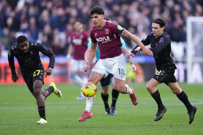 Mateus Fernandes of West Ham United on the ball under pressure during the Premier League match West Ham United vs Sunderland at London Stadium, London, United Kingdom, 24th January 2026, Credit:Harvey Murphy/News Images / Avalon