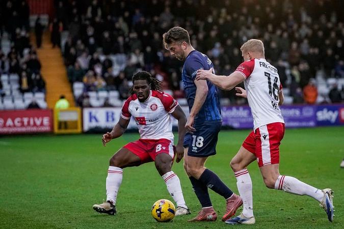 Rhys Oates of Mansfield Town shields the ball from Daniel Phillips of Stevenage and Lewis Freestone of Stevenage during the Sky Bet League 1 match Stevenage vs Mansfield Town at Lamex Stadium, Stevenage, United Kingdom, 24th January 2026, Credit:Maynard Manyowa/News Images / Avalon