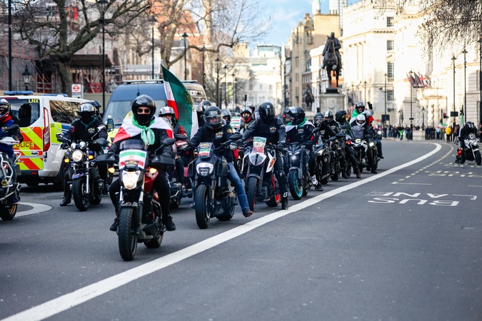 Iranian motorcyclists ride past during a vigil for victims of protests in Iran outside Downing Street in London, UK, on 24 January 2026., Credit:Pete Speller / Avalon