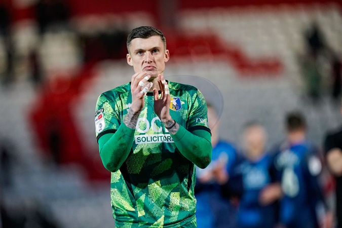 Liam Roberts of Mansfield Town applauds the fans after the final whistle during the Sky Bet League 1 match Stevenage vs Mansfield Town at Lamex Stadium, Stevenage, United Kingdom, 24th January 2026, Credit:Maynard Manyowa/News Images / Avalon