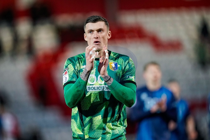 Liam Roberts of Mansfield Town applauds the fans after the final whistle during the Sky Bet League 1 match Stevenage vs Mansfield Town at Lamex Stadium, Stevenage, United Kingdom, 24th January 2026, Credit:Maynard Manyowa/News Images / Avalon
