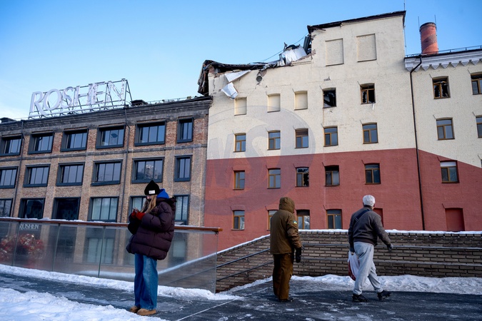 People stand outside a confectionery factory affected by a Russian attack, Kyiv, January 24, 2026. The Roshen confectionery factory in Kyiv's Holosiivskyi district was damaged in a large-scale overnight Russian strike on January 24, 2026. One employee was killed, two others were injured, and both production and office buildings sustained damage., Credit:Danylo Antoniuk / Avalon