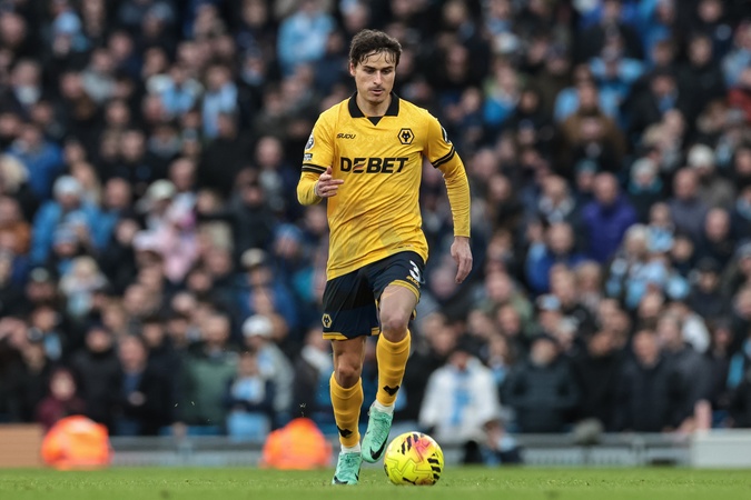 Hugo Bueno of Wolverhampton Wanderers with the ball during the Premier League match Manchester City vs Wolverhampton Wanderers at Etihad, Manchester, United Kingdom on 24 January 2026, Credit:Mark Cosgrove/News Images / Avalon