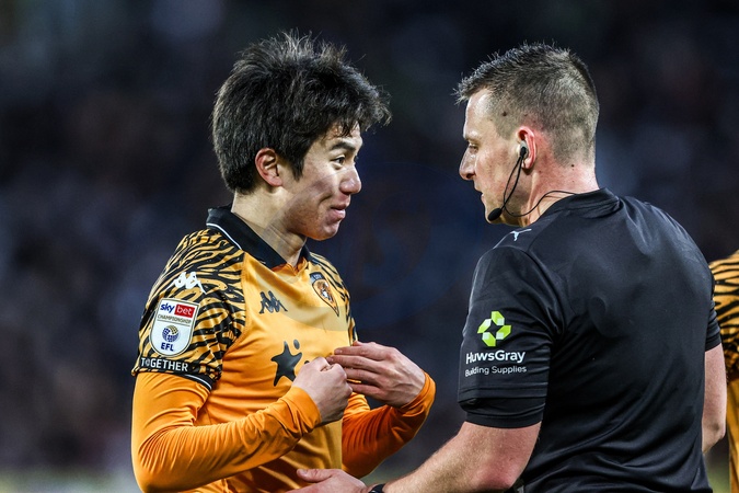 Yu Hirakawa of Hull City and referee Josh Smith have a discussion during the Sky Bet Championship match Hull City vs Swansea City at MKM Stadium, Hull, United Kingdom on 24 January 2026, Credit:Ae Cosgrove/News Images / Avalon