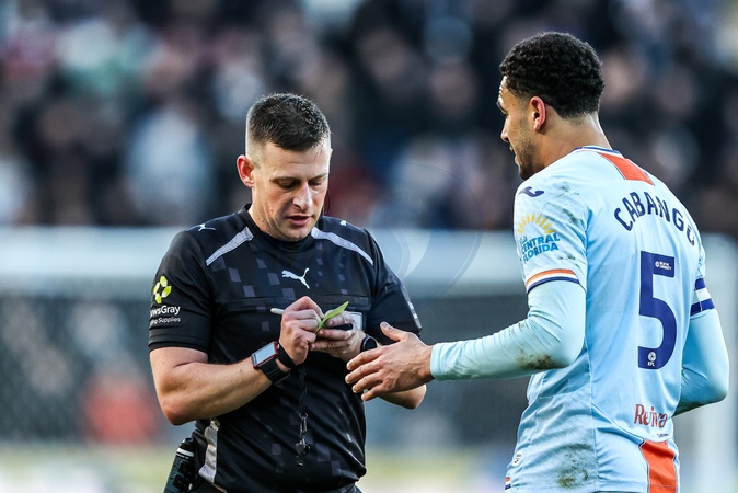 Ben Cabango of Swansea City appeals to referee Josh Smith after Cameron Burgess of Swansea City is given a yellow card during the Sky Bet Championship match Hull City vs Swansea City at MKM Stadium, Hull, United Kingdom on 24 January 2026, Credit:Ae Cosgrove/News Images / Avalon