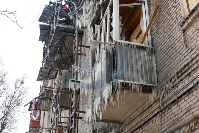 Icicles hang from balconies at an apartment block damaged by a Russian drone strike, Kharkiv, Ukraine, January 24, 2026. The overnight Russian attack left 27 people injured. Residential buildings, a maternity hospital, and a dormitory were also damaged., Credit:Viacheslav Madiievskyi / Avalon