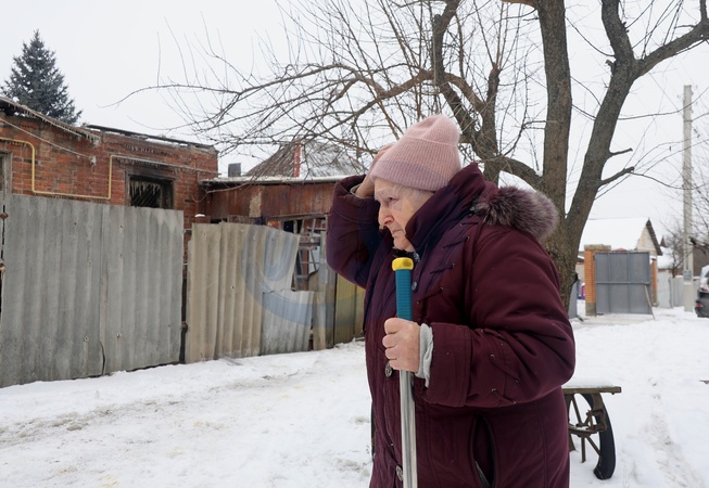 Pensioner Mariia Ilarionivna, who survived a Russian drone strike on her house, meets the press, Kharkiv, Ukraine, January 24, 2026. The overnight Russian attack left 27 people injured. Residential buildings, a maternity hospital, and a dormitory were also damaged., Credit:Viacheslav Madiievskyi / Avalon