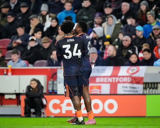 Taiwo Awoniyi of Nottingham Forest celebrates his goal to make it 0-2 during the Premier League match Brentford vs Nottingham Forest at The Gtech Community Stadium, London, United Kingdom, 25th January 2026, Credit:Maynard Manyowa/News Images / Avalon