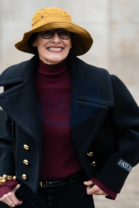 Inès de la Fressange wears red turtleneck sweater, black pants, black cropped coat, yellow bucket hat, outside Patou Menswear Fall/Winter 2026-2027 show as part of Paris Fashion Week on January 25, 2026 in Paris, France., Credit:Lounis Tiar / Avalon