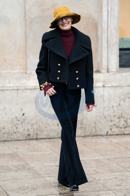 Inès de la Fressange wears red turtleneck sweater, black pants, black cropped coat, yellow bucket hat, outside Patou Menswear Fall/Winter 2026-2027 show as part of Paris Fashion Week on January 25, 2026 in Paris, France., Credit:Lounis Tiar / Avalon