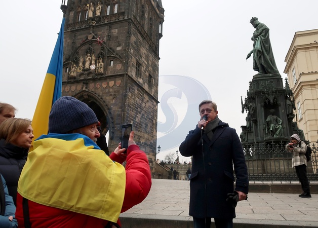 Ambassador Extraordinary and Plenipotentiary of Ukraine to the Czech Republic Vasyl Zvarych delivers a speech during the annual "Chain of Unity" marking Ukraine's Day of Unity, during which nearly 100 Ukrainians unfolded a 30-meter blue-and-yellow Ukrainian flag across Charles Bridge, uniting the two banks of the Vltava River, Prague, the Czech Republic, January 24, 2026., Credit:Olha Tanasiichuk / Avalon