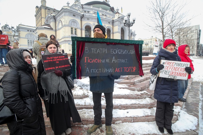 Demonstrators hold placards during the "Do Not Be Silent! Captivity Kills" rally to remind people about the prisoners of war from the Mariupol garrison, all captive and missing defenders of Ukraine outside the Taras Shevchenko National Academic Opera and Ballet Theatre in Kyiv, Ukraine, January 25, 2026., Credit:Pavlo Bahmut / Avalon