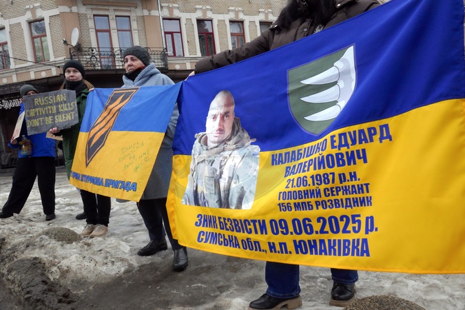 Activists hold placards and banners during the "Do Not Be Silent! Captivity Kills" rally to remind people about the prisoners of war from the Mariupol garrison, all captive and missing defenders of Ukraine in Shandora Petefi Square in Uzhhorod, Ukraine, January 25, 2026., Credit:Yulii Zozulia / Avalon