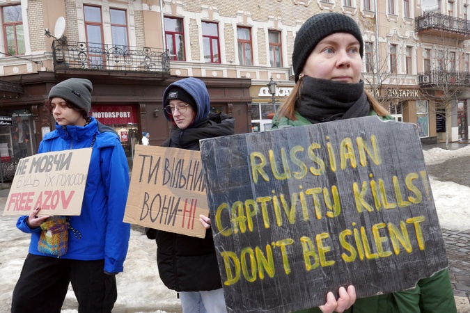 Activists hold placards during the "Do Not Be Silent! Captivity Kills" rally to remind people about the prisoners of war from the Mariupol garrison, all captive and missing defenders of Ukraine in Shandora Petefi Square in Uzhhorod, Ukraine, January 25, 2026., Credit:Yulii Zozulia / Avalon