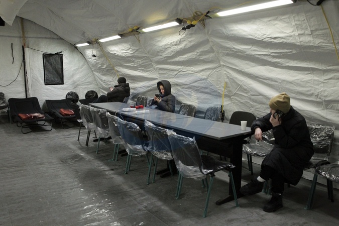People stay in a mobile heating tent set up in Kyiv's northern left-bank Desnianskyi district to counter power and heating outages caused by Russian strikes on Ukraine's energy infrastructure, Kyiv, Ukraine, January 25, 2026., Credit:Hennadii Minchenko / Avalon
