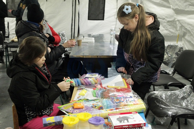 Two girls explore art supplies in a mobile heating tent set up in Kyiv's northern left-bank Desnianskyi district to counter power and heating outages caused by Russian strikes on Ukraine's energy infrastructure, Kyiv, Ukraine, January 25, 2026., Credit:Hennadii Minchenko / Avalon