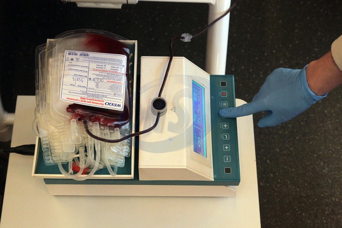 A medical worker presses the control button of a scale-mixer used for controlled blood collection during an open blood donation campaign on the ground floor of the Teplokrovni mobile donor hub outside the Desnianskyi District State Administration building, Kyiv, Ukraine, on January 23, 2026, Credit:Hennadii Minchenko / Avalon