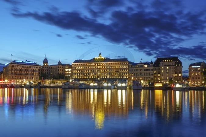 Sweden, Night view of the Grand Hotel Stockholm on the Stockholm waterway., Credit:Fabio Mazzarella / Avalon