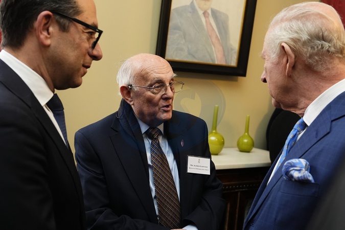 King Charles III speaks with Holocaust survivor Alfred Garwood during a reception at Buckingham Palace in London to mark Holocaust Memorial Day. Picture date: Tuesday January 27, 2026., Credit:Aaron Chown / Avalon