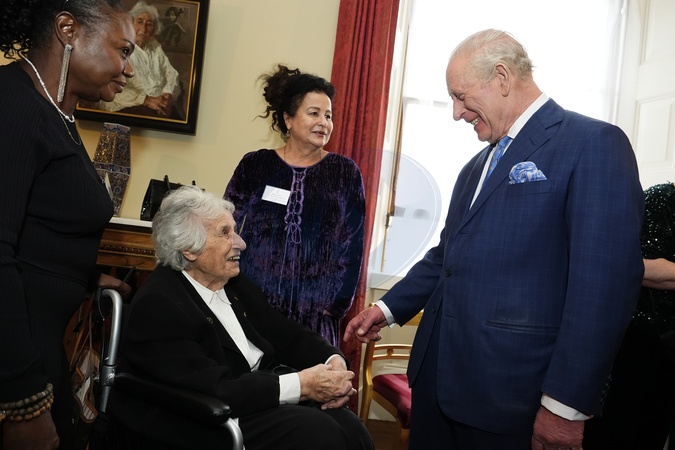 King Charles III speaks with Anita Lasker-Wallfisch, the last remaining survivor of the Women's Orchestra of Auschwitz, during a reception at Buckingham Palace in London to mark Holocaust Memorial Day. Picture date: Tuesday January 27, 2026., Credit:Aaron Chown / Avalon