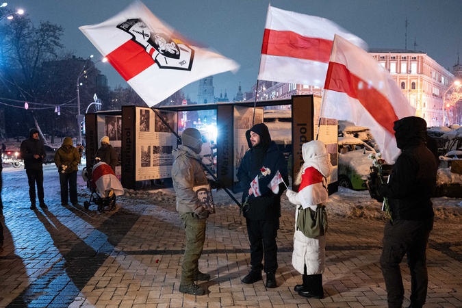 People hold white-red-white opposition flags during a memorial event dedicated to Belarusian volunteers who died in the Russian-Ukrainian war at Mykhailivska Square in Kyiv, Ukraine, on January 26, 2026, Credit:Danylo Antoniuk / Avalon