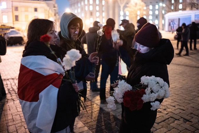 People hand out flowers during a commemoration event honoring Belarusian volunteers killed in the Russian-Ukrainian war at Mykhailivska Square, Kyiv, Ukraine, on January 26, 2026, Credit:Danylo Antoniuk / Avalon