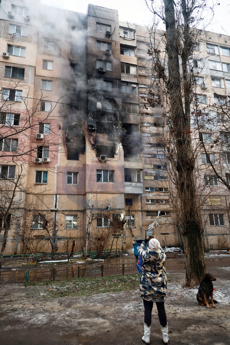 Black smoke pours from apartments of a nine-storey residential building as a woman photographs the scene following a Russian strike drone strike on Odesa, Ukraine, on January 27, 2026. An overnight Russian drone attack on January 27 left Odesa with significant infrastructure damage. Authorities reported 22 affected people, 14 of whom sustained minor injuries. Search and rescue work continues at the strike sites, Credit:Nina Liashonok / Avalon