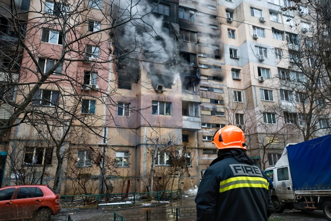 Black smoke rises from apartments of a nine-storey residential building as a firefighter stands outside following a Russian drone attack in Odesa, Ukraine, on January 27, 2026. An overnight Russian drone attack on January 27 left Odesa with significant infrastructure damage. Authorities reported 22 affected people, 14 of whom sustained minor injuries. Search and rescue work continues at the strike sites, Credit:Nina Liashonok / Avalon