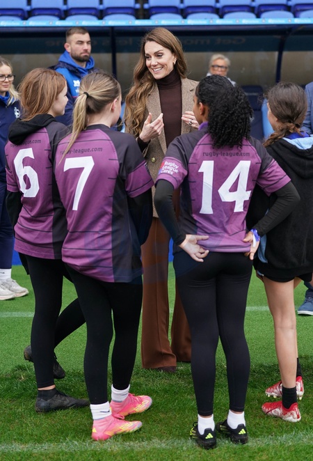 27/01/2026. Wakefield, UK. The Princess of Wales during a visit to Wakefield Trinity Rugby League club. Her Royal Highness met Marc Lovering, the RFL's Director of Performance and Development. The Princess then joined a session with the In Touch programme, which provides an open space for elderly people within the local community to help tackle social isolation by hosting quizzes, workshops and stadium tours. The Princess also met with young people from Wakefield's Inspiring Futures programme, which supports those who are at risk of anti-social behaviour and youth crime through goal setting, stress management, and teamwork. Finally, Her Royal Highness headed out to the rugby pitch and joined a skills session with girls from Wakefield's Champion Schools competition., Credit:Pete Maclaine / Avalon
