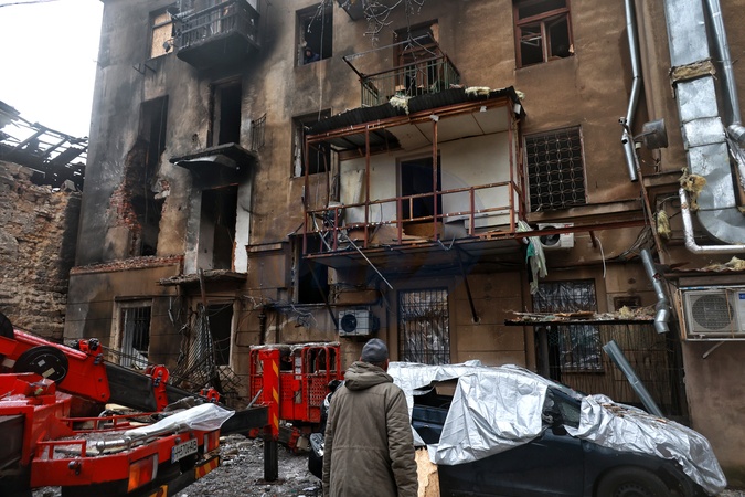 A man looks at a building damaged by a Russian drone strike, Odesa, Ukraine, January 27, 2026. The large-scale overnight attack destroyed or damaged dozens of apartments, shattered facades and windows, and left three people dead., Credit:Nina Liashonok / Avalon