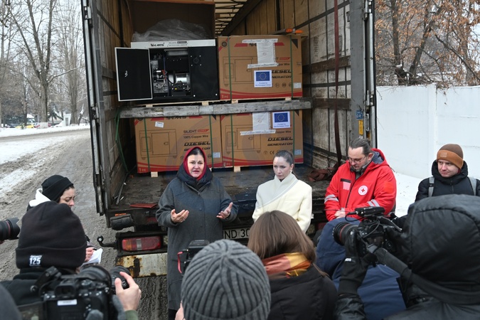 Ambassador of the EU to Ukraine Katarina Mathernova, Deputy Minister for Communities and Territories Development of Ukraine Maryna Denysiuk and Deputy Director General of the Ukrainian Red Cross Society Illia Kletskovskyi (L to R) speak to the press during the transfer of 76 emergency generators from EU strategic reserves delivered as part of the first batch to Kyiv, Ukraine, January 27, 2026. In total, Ukraine will receive 447 generators to support heating and water supply services in educational, social, and medical institutions, bomb shelters, and heating points in the capital and front-line communities affected by Russian strikes on the country's energy infrastructure., Credit:Yevhen Kotenko / Avalon