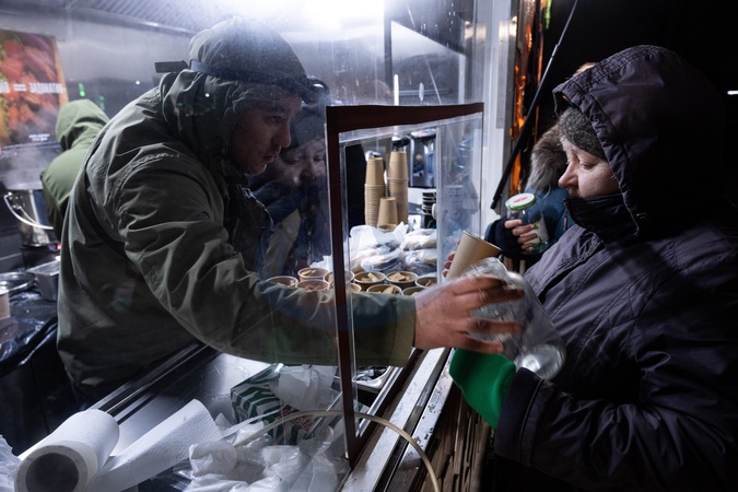 Volunteers from the "Angels” Patronage Service of the Third Army Corps, including war veterans and active military personnel, serve hot drinks from a food truck in the Obolonskyi district, Kyiv, Ukraine, January 27, 2026. Russian strikes on Ukraine's energy facilities have left the capital facing severe power and heating shortages, with emergency outages in place across the city., Credit:Danylo Antoniuk / Avalon