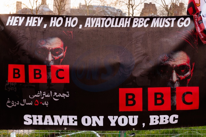Parliament Square, London, UK. 27th January 2026.A banner criticising the BBC for it's lack of coverage of the protests and mass Killings in Iran, calls the British Broadcasting Corporation, "Ayatollah BBC"Protesters and members of the Iranian community in London continue their weekly protest opposite the Houses of Parliament, calling for the UK government to place the Islamic Revolutionary Guard Corps (IRGC) on Britain's terrorist list., Credit:Photo by Amanda Rose / Avalon