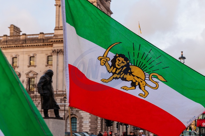 Parliament Square, London, UK. 27th January 2026.The imperial Lion and Sun flag of Iran, flown near the statue of Winston Churchill, in Parliament Square.Protesters and members of the Iranian community in London continue their weekly protest opposite the Houses of Parliament, calling for the UK government to place the Islamic Revolutionary Guard Corps (IRGC) on Britain's terrorist list., Credit:Photo by Amanda Rose / Avalon