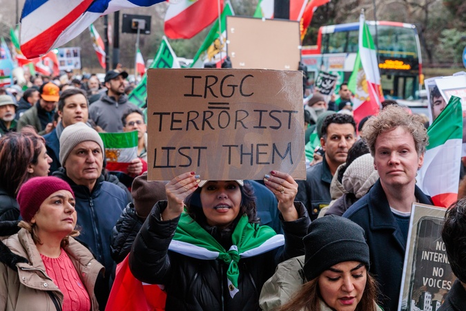 Iranian Embassy, London, UK. 25th January 2026.Activists and members of the Iranian community march through London in support of demonstrations in Iran. Waving Imperial Lion and Sun Iranian flags alongside GB Union Jack flags, Israeli flags and American flags, they are urging US President Trump to keep his promise to support the Iranian people against the violence and repression by the Islamic Republic regime and for the UK government put the Islamic Revolutionary Guard Corps (IRGC) on the list of terrorist organisations and shut down the Islamic Regime Embassy., Credit:Photo by Amanda Rose / Avalon