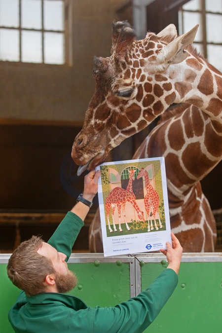London Zoo's giraffes peer at a new London Underground poster in which they star, as ZSL marks 200 years. The new poster, designed by Eliza Southwood, is the grand finale of London Transport Museum and TfL's ‘Great days out' poster series that celebrates renowned cultural attractions in the capital, including Dulwich Picture Gallery, London Transport Museum in Covent Garden and the Royal Albert Hall in South Kensington. Posters and 30x40cm artwork prints will be available to buy from London Zoo or through ZSL's online shop at https://shop.zsl.org/. Picture date: Friday January 23, 2026., Credit:Johnny Green / Avalon