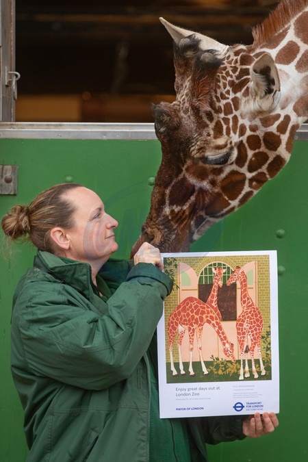 London Zoo's giraffes peer at a new London Underground poster in which they star, as ZSL marks 200 years. The new poster, designed by Eliza Southwood, is the grand finale of London Transport Museum and TfL's ‘Great days out' poster series that celebrates renowned cultural attractions in the capital, including Dulwich Picture Gallery, London Transport Museum in Covent Garden and the Royal Albert Hall in South Kensington. Posters and 30x40cm artwork prints will be available to buy from London Zoo or through ZSL's online shop at https://shop.zsl.org/. Picture date: Friday January 23, 2026., Credit:Johnny Green / Avalon