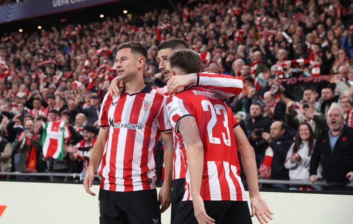 Gorka Guruzeta (Athletic Club), Oihan Sancet (Athletic Club) and Robert Navarro (Athletic Club) celebrate after scoring his team's first goal, Credit:Juan Lazkano Photobilbao / Avalon