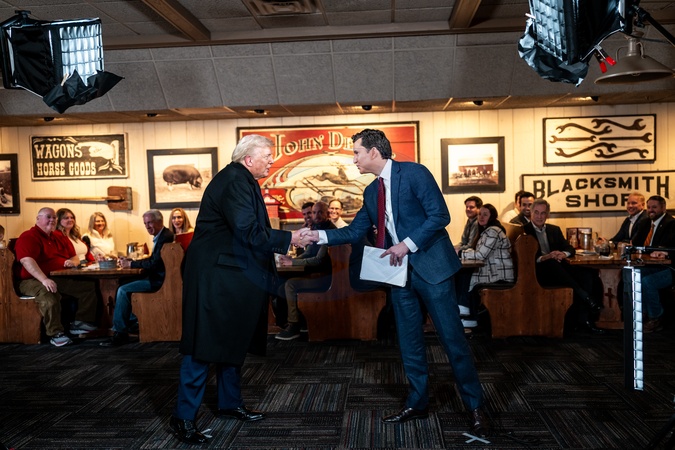 President Donald Trump participates in an interview with Will Cain of Fox News at the Machine Shed restaurant in Urbandale, Iowa on Tuesday, January 27, 2026., Credit:Molly Riley / Avalon